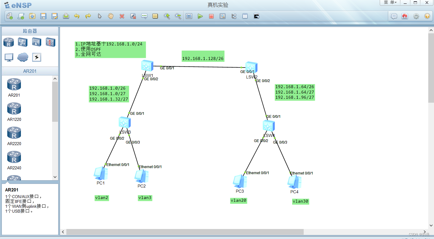 此实验三层交换机模拟实现路由器的功能,重点(不要忘了在其他接口配置Trunk干道),使用OSPF协议时应注意区域的划分,以及ABR的配置。