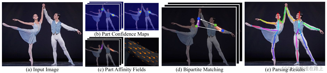 Fig.2 Processus d'organisation (a) Notre méthode utilise l'image entière comme entrée ,PourCNNPrévisions conjointes(b) Cartes de confiance pour la détection des parties du corps humain et (c) Partie associée à PAFs(d) L'étape d'analyse effectue un ensemble de correspondances bipartites pour associer les candidats aux parties du corps (e) Nous les combinons finalement en postures de tout le corps humain dans l'image .