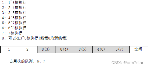 步骤1: 线程8占用所有可执行的核3~5,占用如下所示,小括号里面的是原来执行的线程,灰色为被占用的核