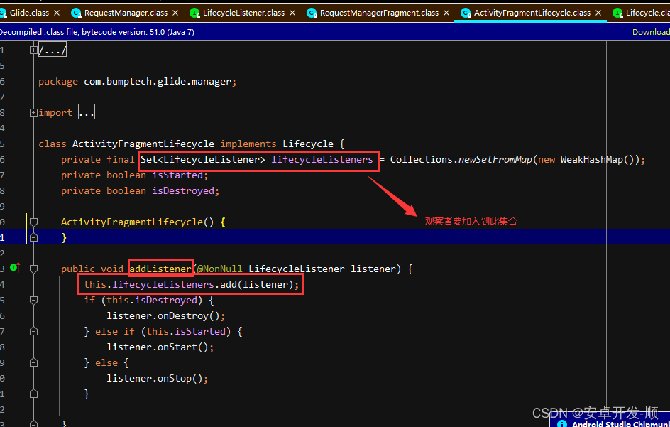 首先,RequestManagerFragment 持有一个 ActivityFragmentLifecycle 对象,这个对象在fragment初始化的时候就被创建出来了,赋值给成员变量 lifecycle。