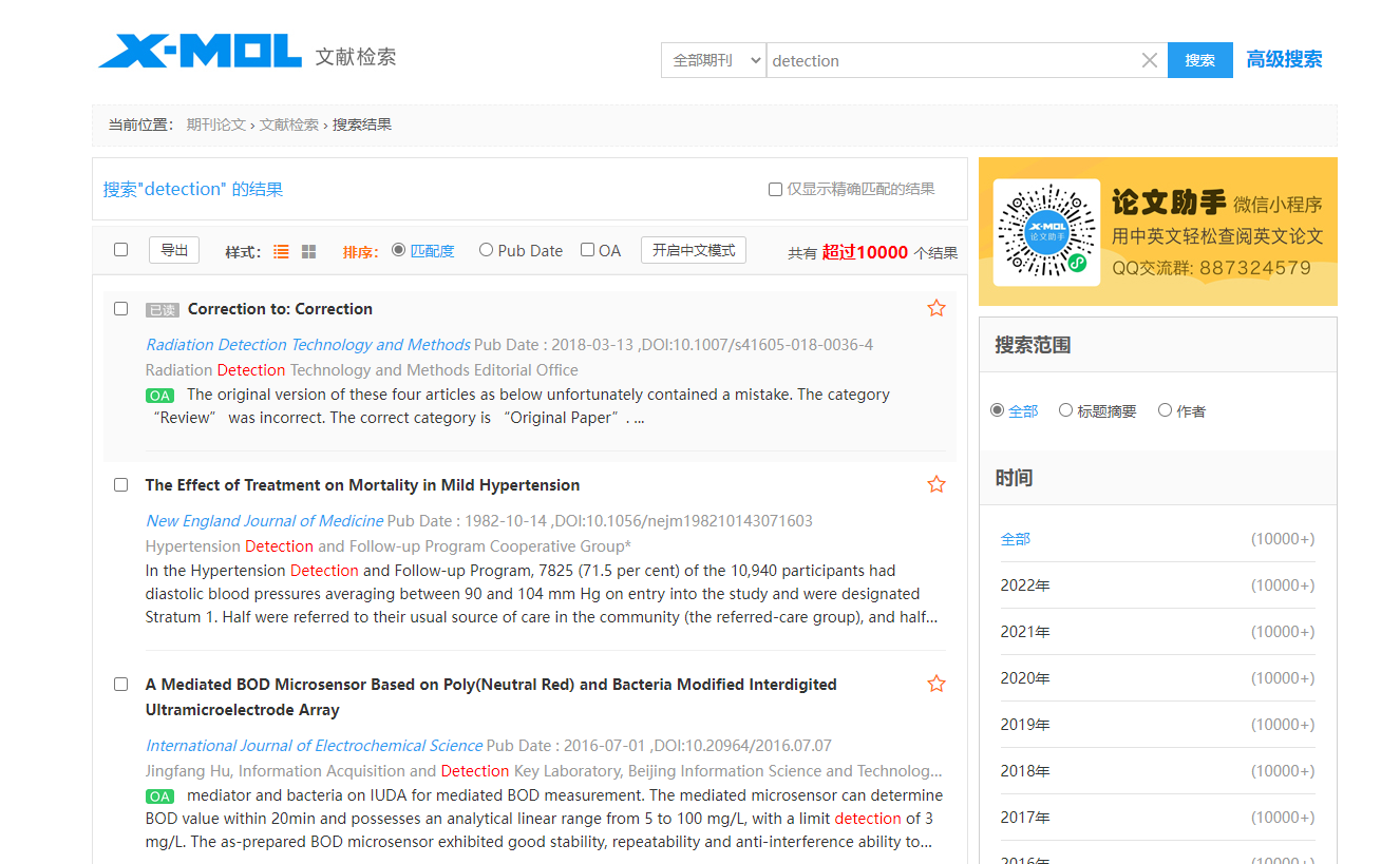 第二个我比较推荐的论文查询网站是 X-MOL,这个比较好的一点是可以通过关键词找到很全的相关的论文,还可以做年份选择,很方便。我一般是两个配合起来使用,这个用来关键字查找论文,那个用来下载论文。