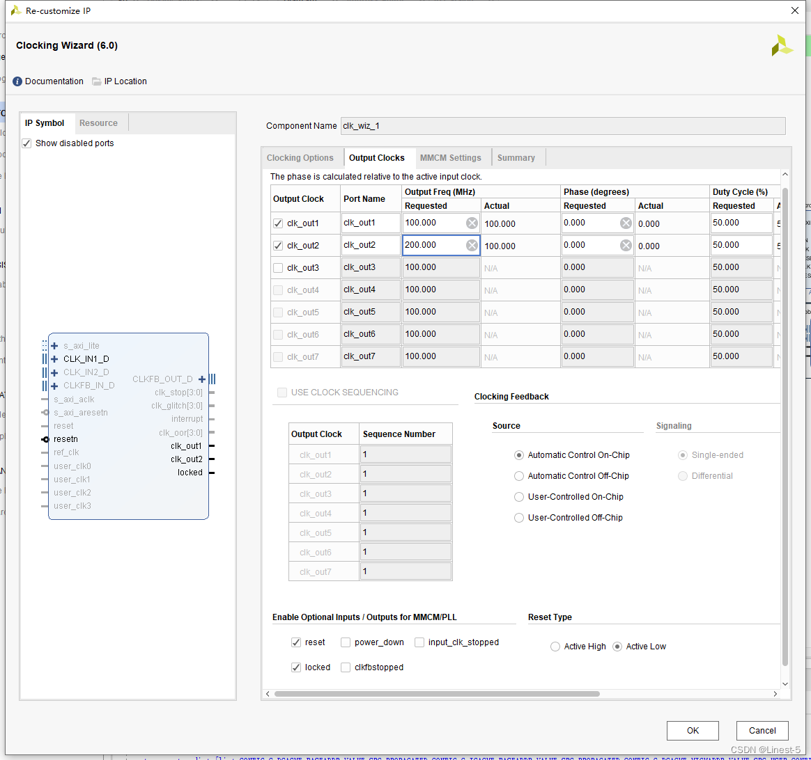 take PLL Add a clock output , And configure reset to low effective ,clk_out1 It's for microblaze_0、 uart、 spi And other modules provide clocks ; clk_out2 to mig_7series_0 The module provides a clock .
