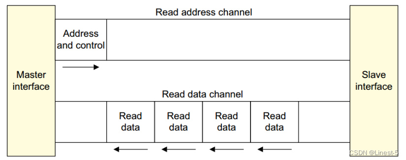 As you can see from the above figure , During a read transmission , The host first gives the read address and control signal in the read address channel , Then the slave returns the read data through the read data channel . In addition, we need to pay attention to , This is a burst read operation , The host only gives one address , Four consecutive bursts of data are read from this address .