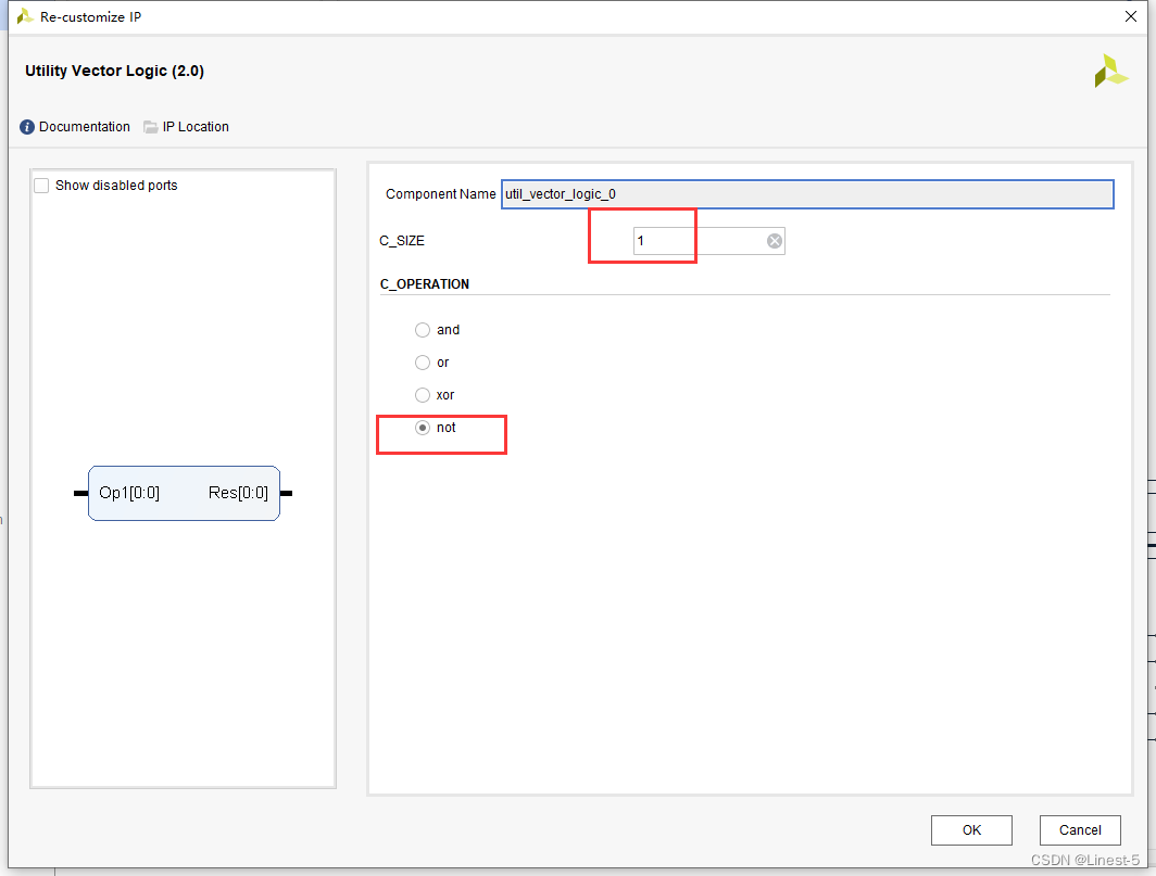 add to Utility Vector Logic IP Core and anti jitter module . take Utility Vector Logic IP The core is configured as a non gate , The seat width is 1, Used as a reverser . This is because you need to use keys as DDR_TEST IP Nuclear start signal , The key on Da Vinci development board is low when pressed , So we add a reverser .