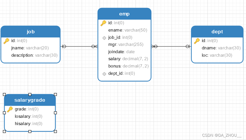 job Table and emp A watch is a one to many relationship emp.job_id=job.id