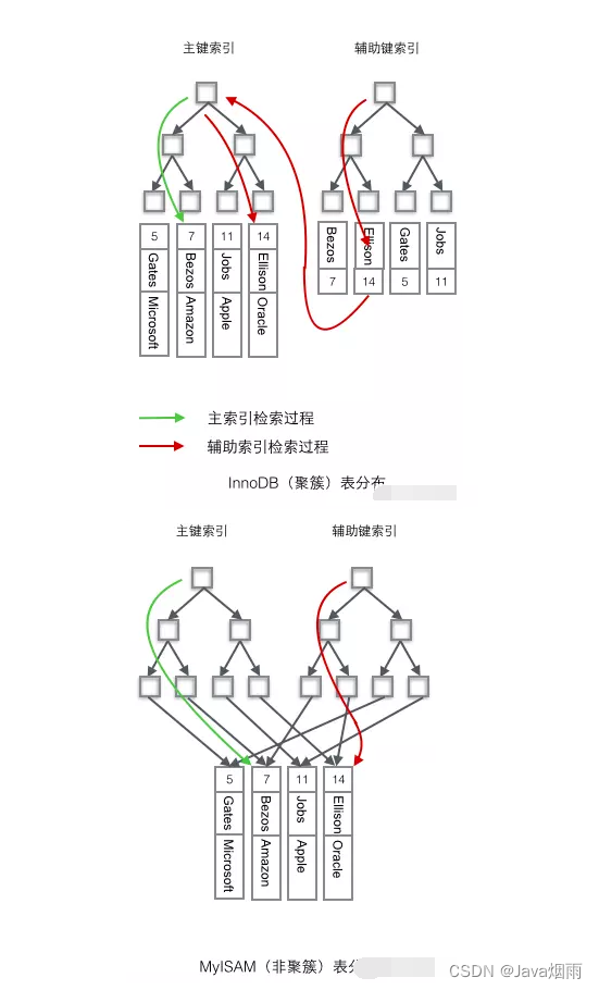 stay MyISAM In the storage engine , The default index is also B+ Tree index , But both the primary index and the secondary index are nonclustered indexes , In other words, the leaf node of the index structure stores an address pointing to the data row . And the secondary index is used to retrieve the index that does not need to access the primary key .