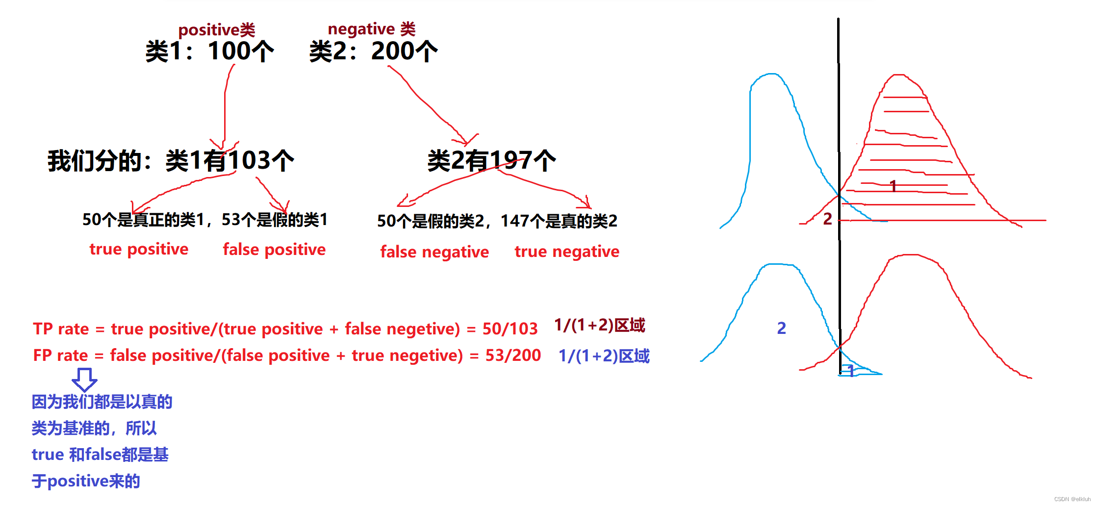 (过程)从左到→右移动移动这条红色的虚线,计算ROC中的每个点,一个虚线就是一个阈值,对应的就是ROC上面的一个点,将ROC连成曲线。在这个图中已经标明了TP,FP,TN,FN,可以很方便的计算出来。