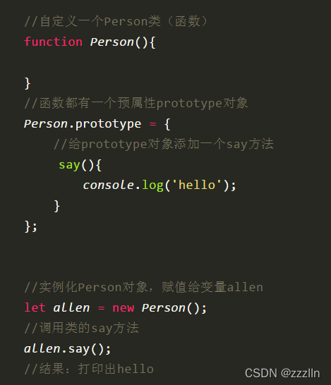 The case code is a little long , But for everyone to understand , I wrote the notes in detail , The previous part is all about object-oriented implementation . Put function Person use new Key word call , This time function Person It is equivalent to a constructor or a class , After instantiation, an object , This object will inherit Person Class prototype Properties and methods of . In the above example , That's the object allen Inherited one say Method , Can be called directly .