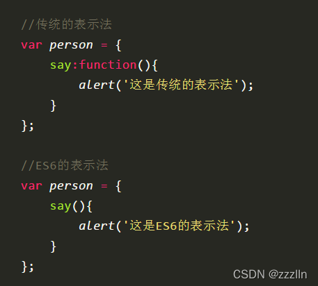 The above case is very simple , Variable person It's an object , Objects contain name Properties and a say Method . The representation is expressed in the form of key value pairs , This is the traditional representation .