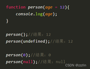 see person( ) Functional 4 Calls and results , Only not transmitted or transmitted undefined The default value assignment will be triggered when , obtain 12, Incoming numbers 0 perhaps null Will not trigger the default value assignment .