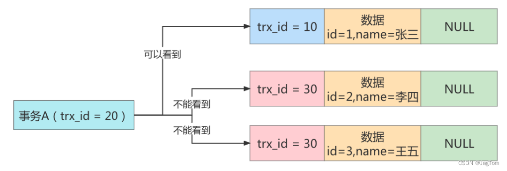 3)同理,id=3 的这条数据,trx_id 也为 30,因此也不能被事务 A 看见。