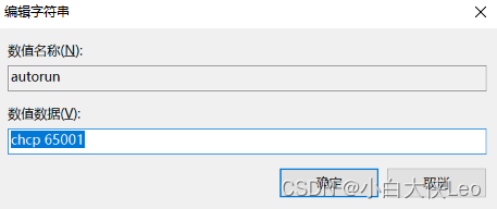然后“右键-新建”,选择“字符串值”,“名称”列填写“autorun”, 数值数据填写“chcp 65001”,注意:中间有空格