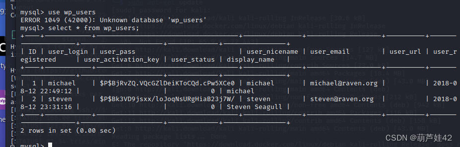 在 databases 里的wordpress,wp_users表里 得到了用户及哈希密码值