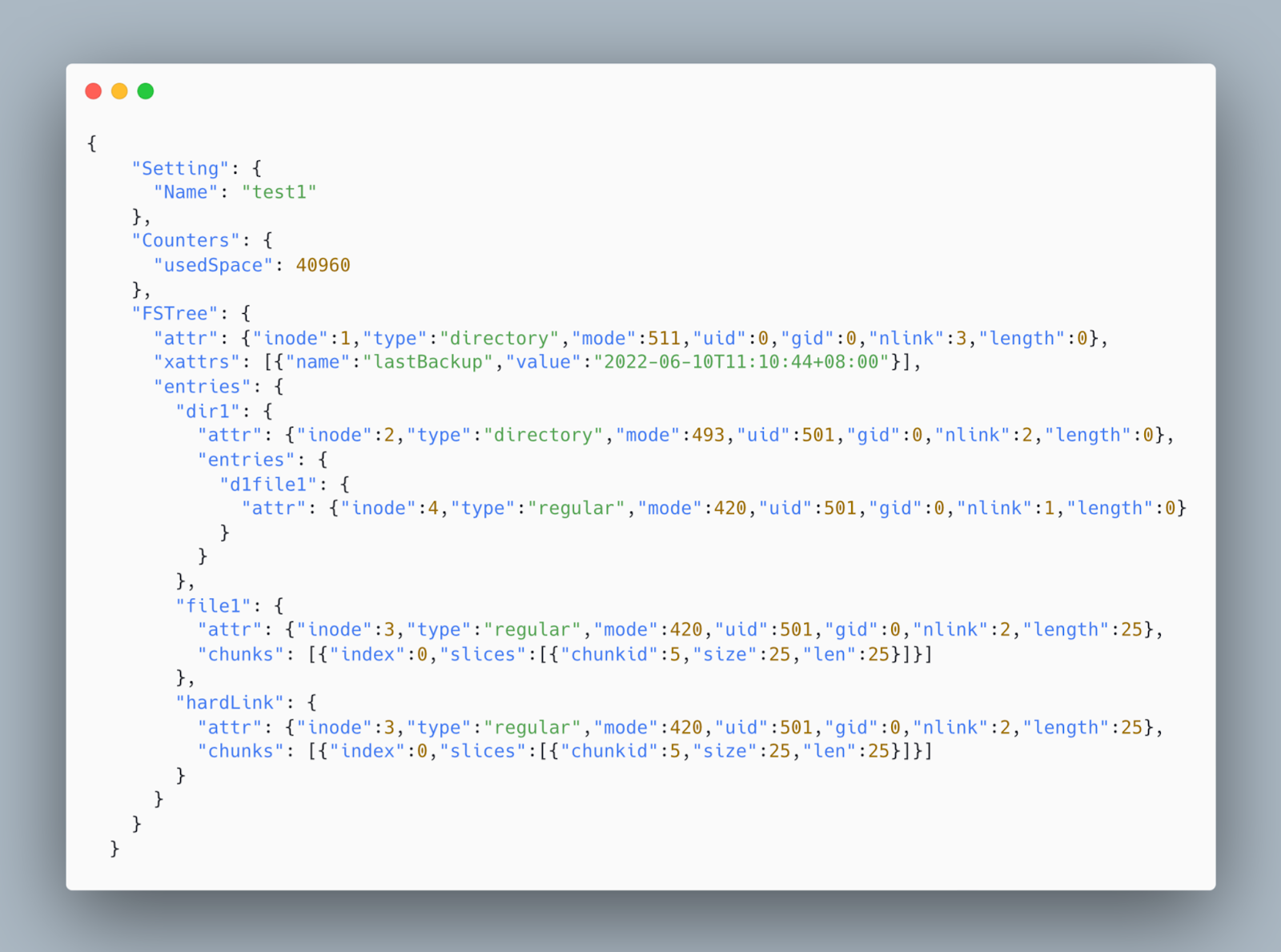 将上面示例文件系统 dump 出来的 json 文件如下所示,其中 hardLink 为 file 的硬链接
