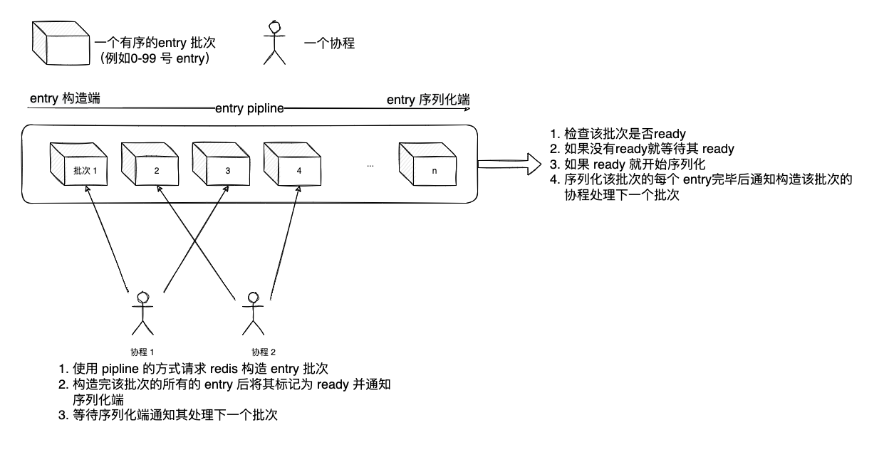 我们可以看着下图,模拟一下流程,假设我们当前源端并发度为 2,那么首先 1 号协程 2 号协程会同时分别构建批次 1,批次 2,而序列化端与在等待批次 1 是否构造完毕,一旦 1 号协程构造完毕批次 1 就会通知序列化端端开始依次序列化批次 1。当批次 1序列化完毕时,序列化端会通知 1 号协程构造批次 3(因为批次 2,批次 4 是该协程 2 处理的,每个协程按照一定规则分配批次序列化端才可以按照规则反过来推算出该通知哪个协程开始构造下一个批次),通知完 1 协程后就会开始序列化批次 2(先检查批次 2 是否 ready,如果没 ready 就等协程 2 通知ready,一般来讲此时批次 2 已经 ready 了),序列化完批次 2 就通知协程 2 开始构造批次 4以此类推。这样就做到了序列化端在序列化 entry 时源端在并行的处理 entry 以便跟上序列化的速度。
