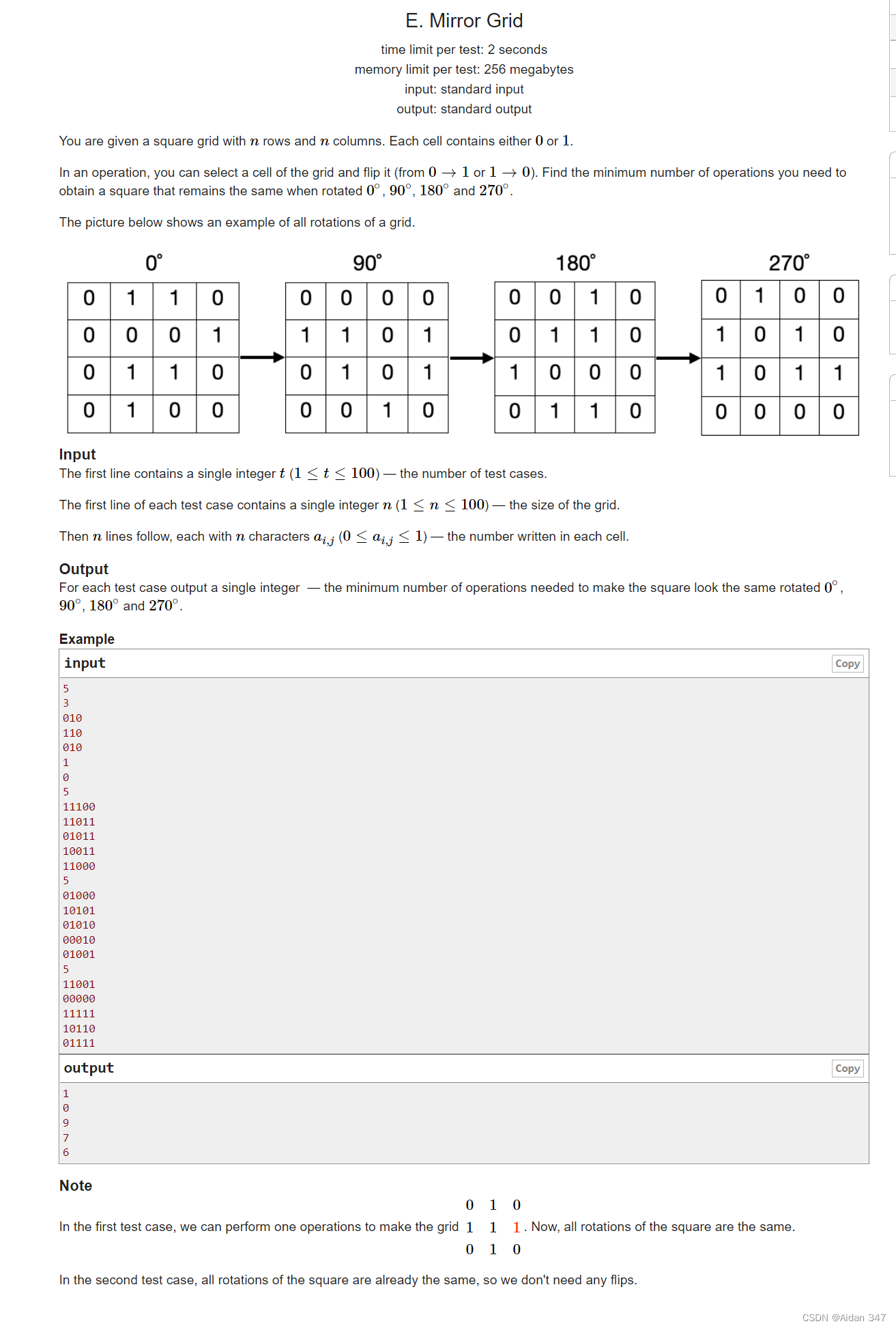 本题要求4个旋转角度得到的都是同一个矩阵,那么就要求每一个1/4矩阵中的点都与他的相关旋转点相同,可以枚举1/4矩阵中的每一个点,通过check(i,j)返回需要改变的点的最小数量