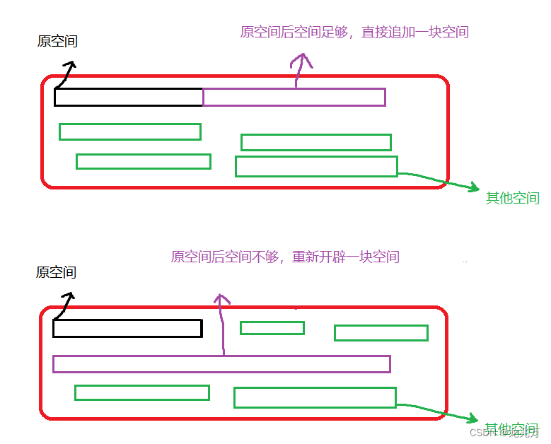 - 原有空间之后有足够大的空间,那么扩展的空间会直接追加上去