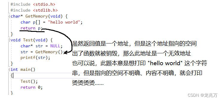 #include <stdio.h> #include <stdlib.h> char* GetMemory(void) { char p[] = "hello world"; return p; } void Test(void) { char* str = NULL; str = GetMemory(); printf(str); } int main() { Test(); return 0; }