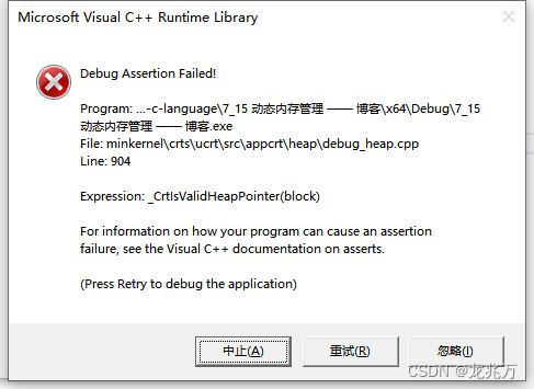 #include <stdlib.h> void test() { int i = 0; int* p = (int*)malloc(10 * sizeof(int)); if (NULL == p) { exit(EXIT_FAILURE); } for (i = 0; i <= 10; i++) { *(p + i) = i;//当i是10的时候越界访问 } free(p); } int main() { test(); return 0; }这种情况编译器是不会报错的,因为我们在使用数组时经常存在这个问题。但是在运行时会发生错误。