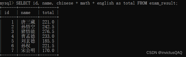 SELECT name, chinese + math + english 总分 FROM exam_result