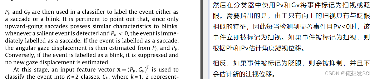 然后在分类器中使用Pv和Gv将事件标记为扫视或眨眼。需要指出的是,由于只有向上的扫视具有与眨眼相似的特征,因此每当检测到显著事件且Pv<0时,该事件立即被标记为扫视。如果事件被标记为扫视,则根据Ph和Pv估计角度凝视位移。-----------因为向上 是垂直方向变化,而Pv就是垂直方向的向量 如果小于0那就没上下动 那就是扫视 ????