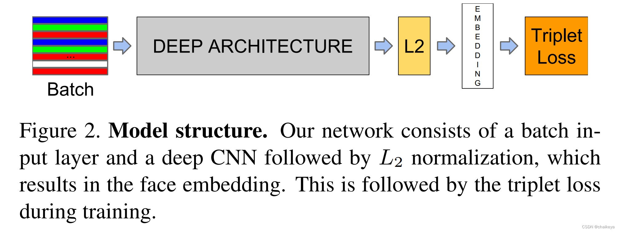 Pictured 2 What it shows is FaceNet Model structure .Deep Architecture It is a deep convolution network elimination softmax Structure after . Then a feature normalization , Map the feature onto a hypersphere , Then a new loss function is proposed Triplet Loss.