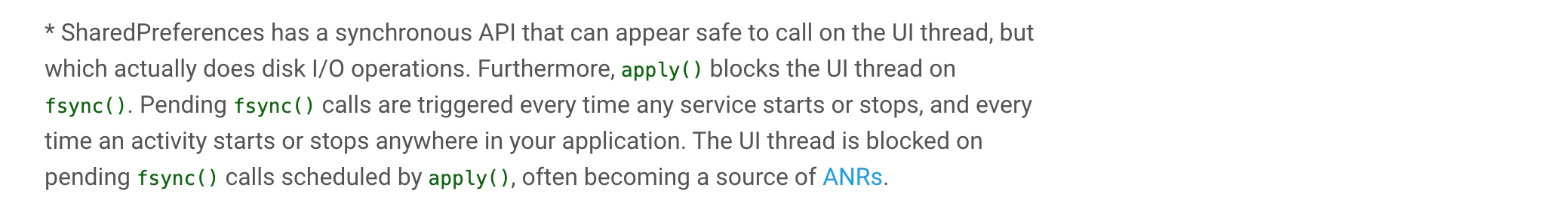 apply() 方法是异步的,为什么还会造成 ANR 呢?曾今的字节跳动就出现过这个问题,具体详情可以点击这里前去查看 剖析 SharedPreference apply 引起的 ANR 问题 而且 Google 也明确指出了 apply() 的问题。