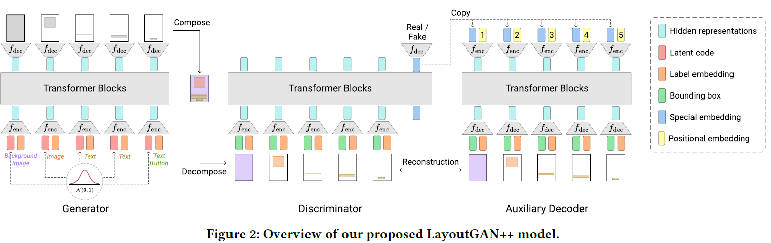 auxiliary decoder: Experience has found that , In well aligned layouts such as documents , The discriminator is trained to be sensitive to alignment and less sensitive to location information , That is, it only cares about whether the elements are aligned , And don't care about the unusual layout , For example, put the title element at the bottom , Therefore, in order to let the discriminator know the location information , Additional regularization is applied , Add an auxiliary decoder to rebuild the bounding box .