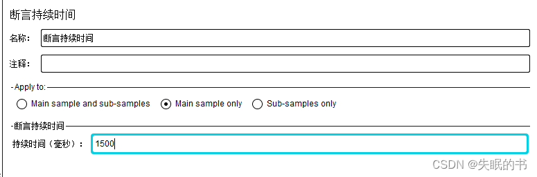 Assertion duration : Get the response data within a limited time , Timeout is also failure ;