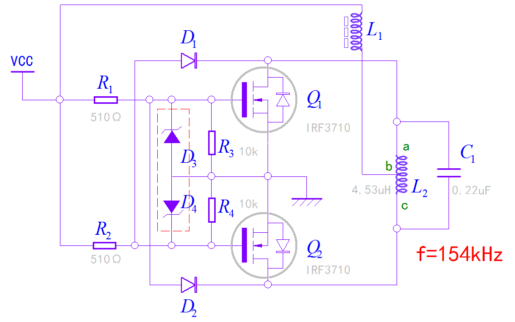 零电压开关震荡 (ZVX) 电路经常用于一些高压、大功率电路中, 电路中的功率MOS管在 导通和关断阶段, 漏极源极之间电压为 0, 这就极大降低了电路功率管上的功耗, 从而可以提高电路的功率输出。 下面为了应用该电路, 探索电路应用原理,搭建一个基本电路进行测试。