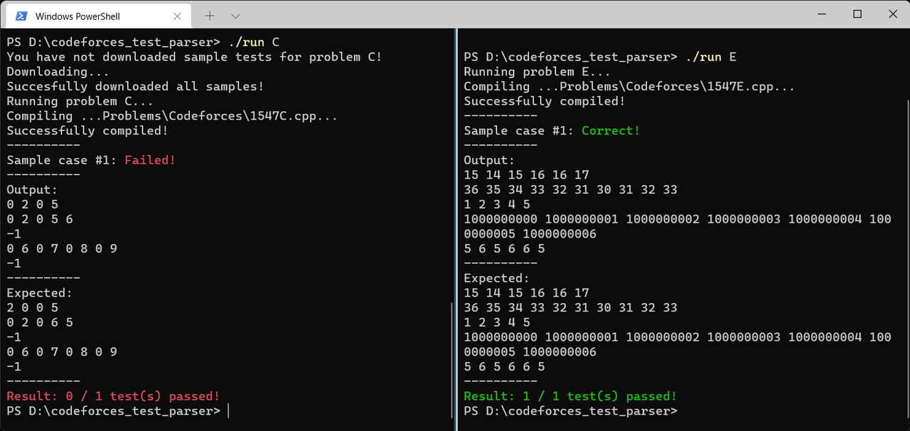 .\run [problem_id]to run sample test cases (only one problem at a time). For example:.\run Afor testing problem A. -