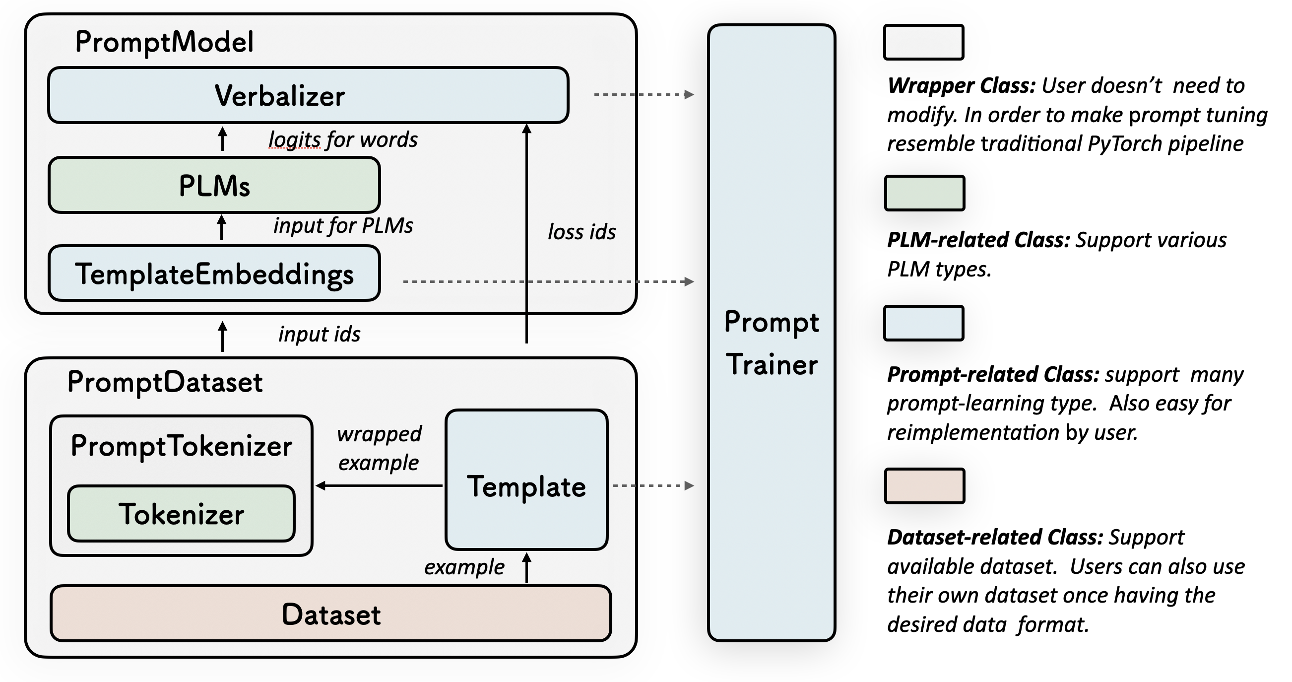 - Use the implementations of current prompt-learning approaches.* We have implemented various of prompting methods, including templating, verbalizing and optimization strategies under a unified standard. You can easily call and understand these methods.
